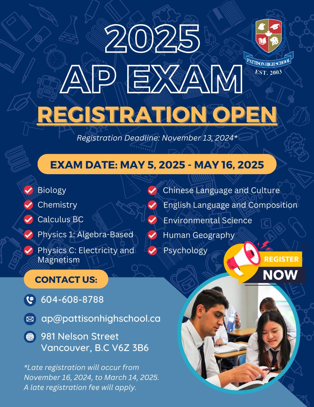 We are delighted to inform you that our school facilitates AP exam registration for external students. To ensure a smooth process, we have outlined the key details below: